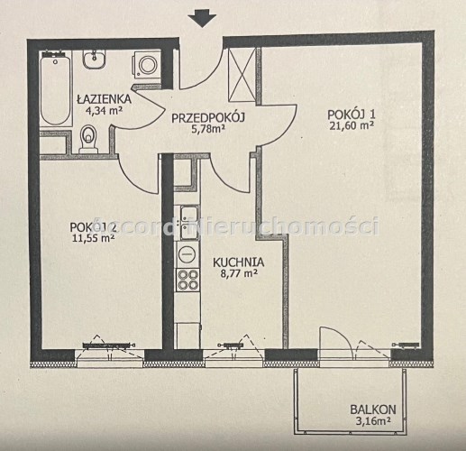 Mieszkanie składa się z 2 pokoi, oddzielnej kuchni, łazienki z wc, przedpokoju i balkonu.